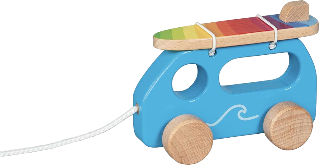 Partons à la plage ! On s'y croirait presque lorsque les plus petits tirent ce magnifique véhicule en bois sur le sol. Une belle planche de surf amovible aux couleurs vives couronne le van. Ce jouet en bois encourage les plus petits dans leur apprentissage de la marche.