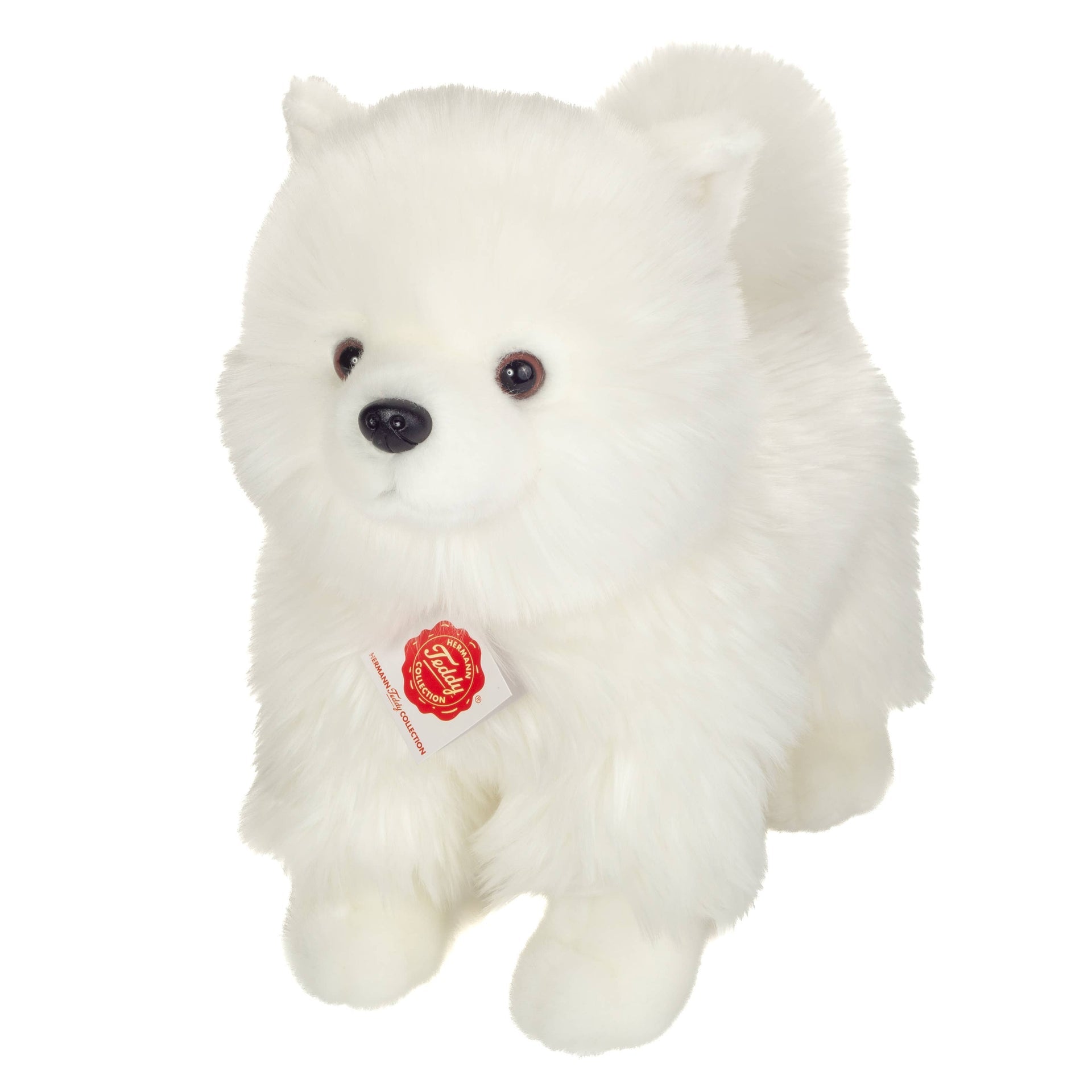 Le spitz nain debout de 35 cm de haut de la collection Hermann Teddy a une apparence élégante grâce à sa fourrure blanche comme neige. C'est une personne affectueuse, intelligente et joyeuse qui crée une bonne humeur dans la chambre des enfants tout au long de la journée. Son caractère enjoué ne laisse aucune place à l'ennui, mais avec son pelage doux et douillet, il est toujours prêt à se blottir longuement.